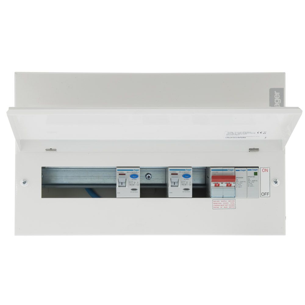 - Complete with: 1x 100A DP main switch, 2x 100A 30mA Type A RCD's, MCB's and Blanks