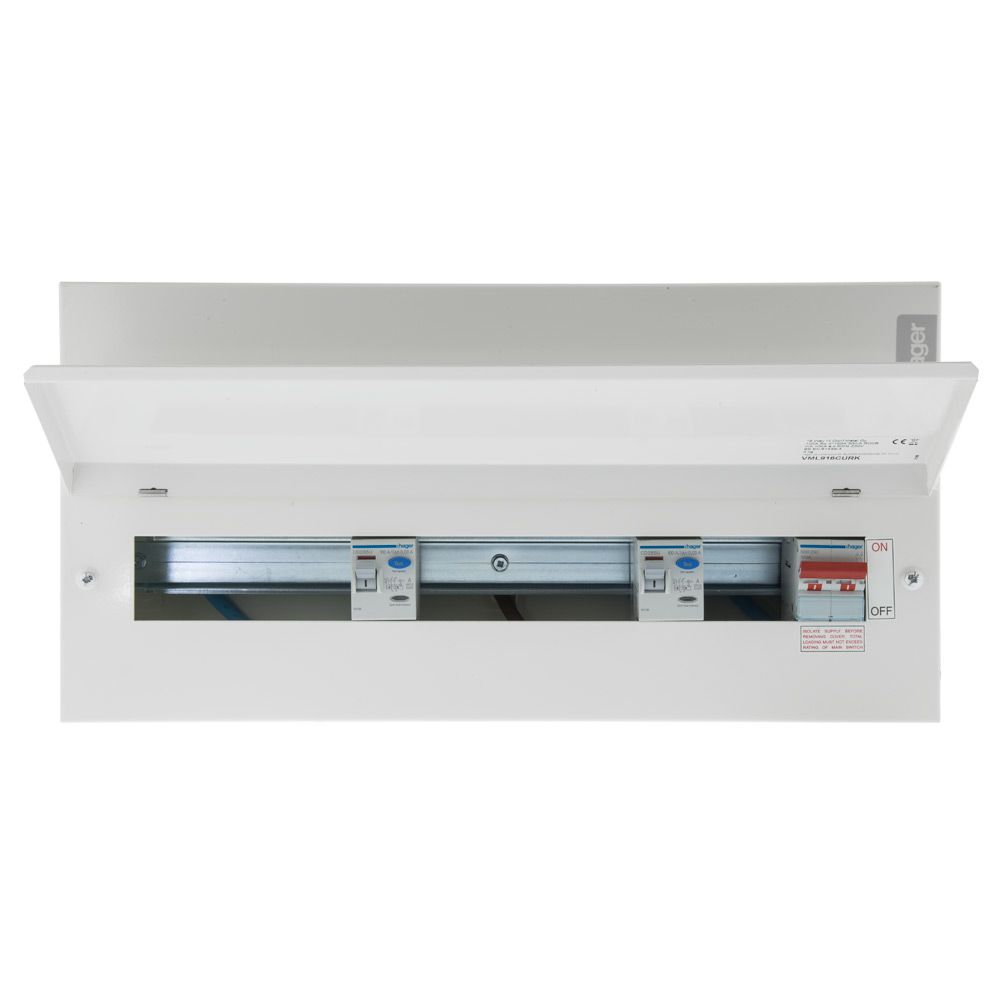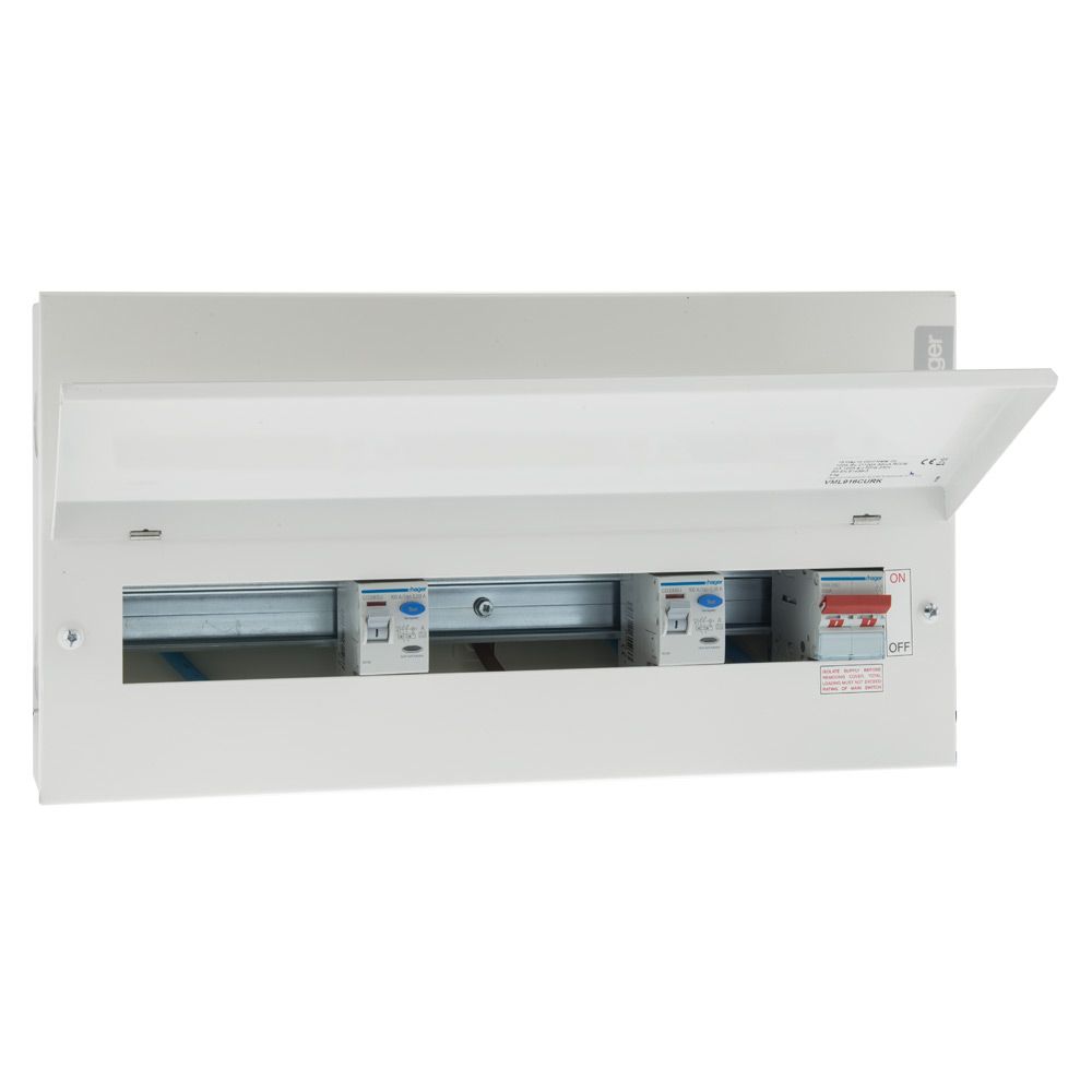 Hager Design 10 high integrity consumer unit, 16-way fuse box includes 2x 100A Type A RCDs and 100A DP main switch. 18th edition compliant and suitable for use in domestic households.