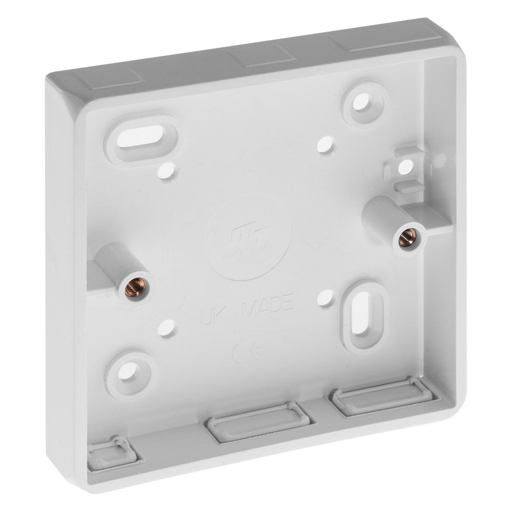Marshall Tufflex PVC pattress box 1 Gang 19mm with rounded corners and three MMT1 or MMT2 mini trunking knockouts. Manufactured from super high impact PVC-U