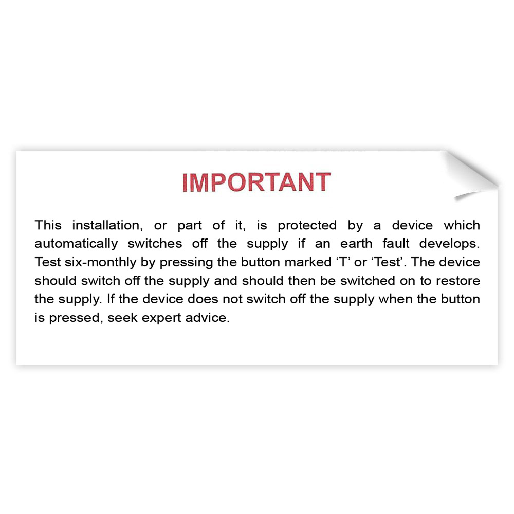 IMPORTANT - This installation, or part of it, is protected by a device which automatically switches off the supply if an earth fault develops. Test six-monthly by pressing the button marked ‘T’ or ‘Test’. The device should switch off the supply and should then be switched on to restore the supply. If the device does not switch off the supply when the button is pressed, seek expert advice.